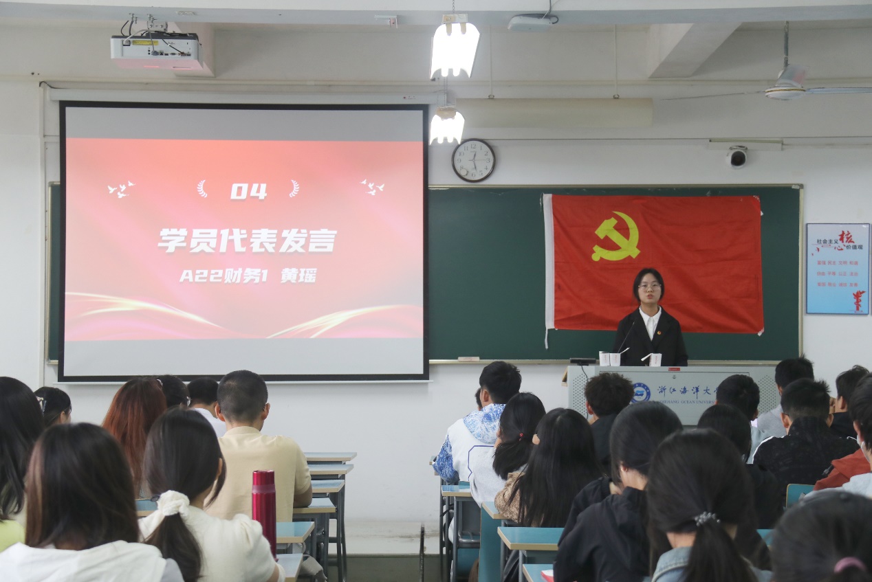 学员代表、来自A22财务1的黄瑶同学代表党训班全体学员向组织表态:第一,端正入党动机,发挥模范作用;第二,服从组织管理,遵守纪律规定;第三,认真对待培训,提升自身素质。黄瑶表示会认真学习和宣扬党的路线、方针、政策,全心全意为同学服务,不断完善自己,争取早日成为一名合格的共产党员。