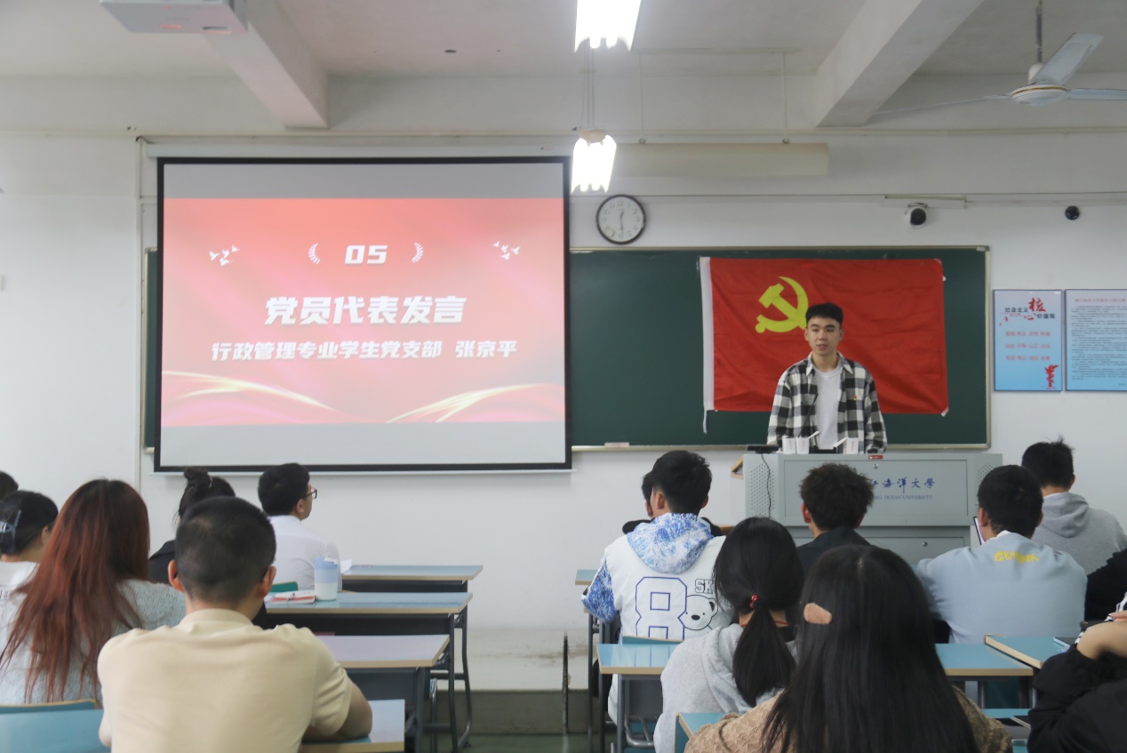 党员代表、来自行政管理专业学生党支部的张京平同学,结合自身参军入伍、两次递交入党申请书、加入校国防青年先锋连等经历,阐述了自己从一个地方青年逐渐成长为一名合格的战士,最终成长为一名共产党员的奋斗历程。张京平呼吁同学们要时刻保持对党忠诚的初心,牢记自己的责任和使命,不断提升自身的能力,为党和人民事业的发展贡献青春力量。