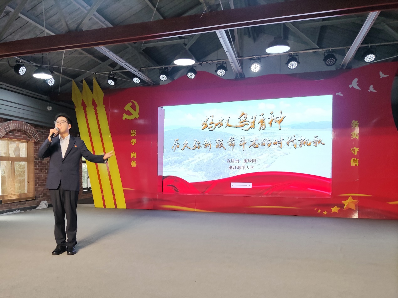 施辰阳老师以《蚂蚁岛精神——历久弥新、鼓舞斗志的时代凯歌》为题展开宣讲。他以入职时奔赴蚂蚁岛开启“红色第一课”为切入点,回忆了丁荷叶同志深情讲述蚂蚁岛妇女投身“三八海塘”建设的场景,分享了他对蚂蚁岛精神的初步认识。他结合中国东海的岛外离岛——嵊泗壁下岛责任区民警、全国优秀人民警察王佳辉的守岛故事,分享了他对蚂蚁岛精神的深层次感悟,并表达了他作为一名人民教师,愿与青春使命同行,用镜头和笔触讲好蚂蚁岛故事,用责任与担当践行蚂蚁岛精神的决心。
