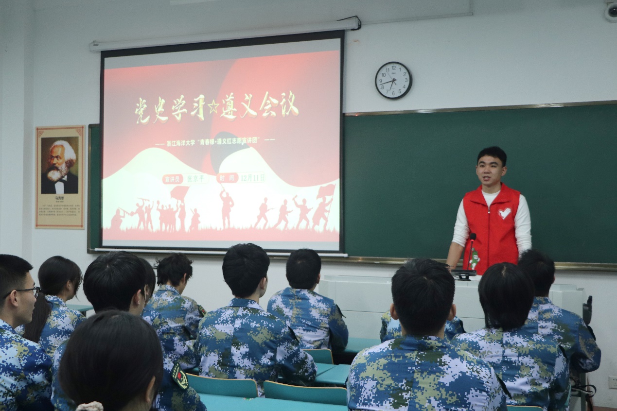 为弘扬遵义会议精神,坚定道路自信,传承红色文化基因,2023年12月11日晚,黄色网站 “青春绿·遵义红”志愿宣讲团成员、校国防青年先锋连连长、A21行政1班党员张京平同志于新城校区公共教学楼217教室,为校国防青年先锋连成员宣讲遵义会议精神。各部排骨干及队员共40余人参加宣讲活动。