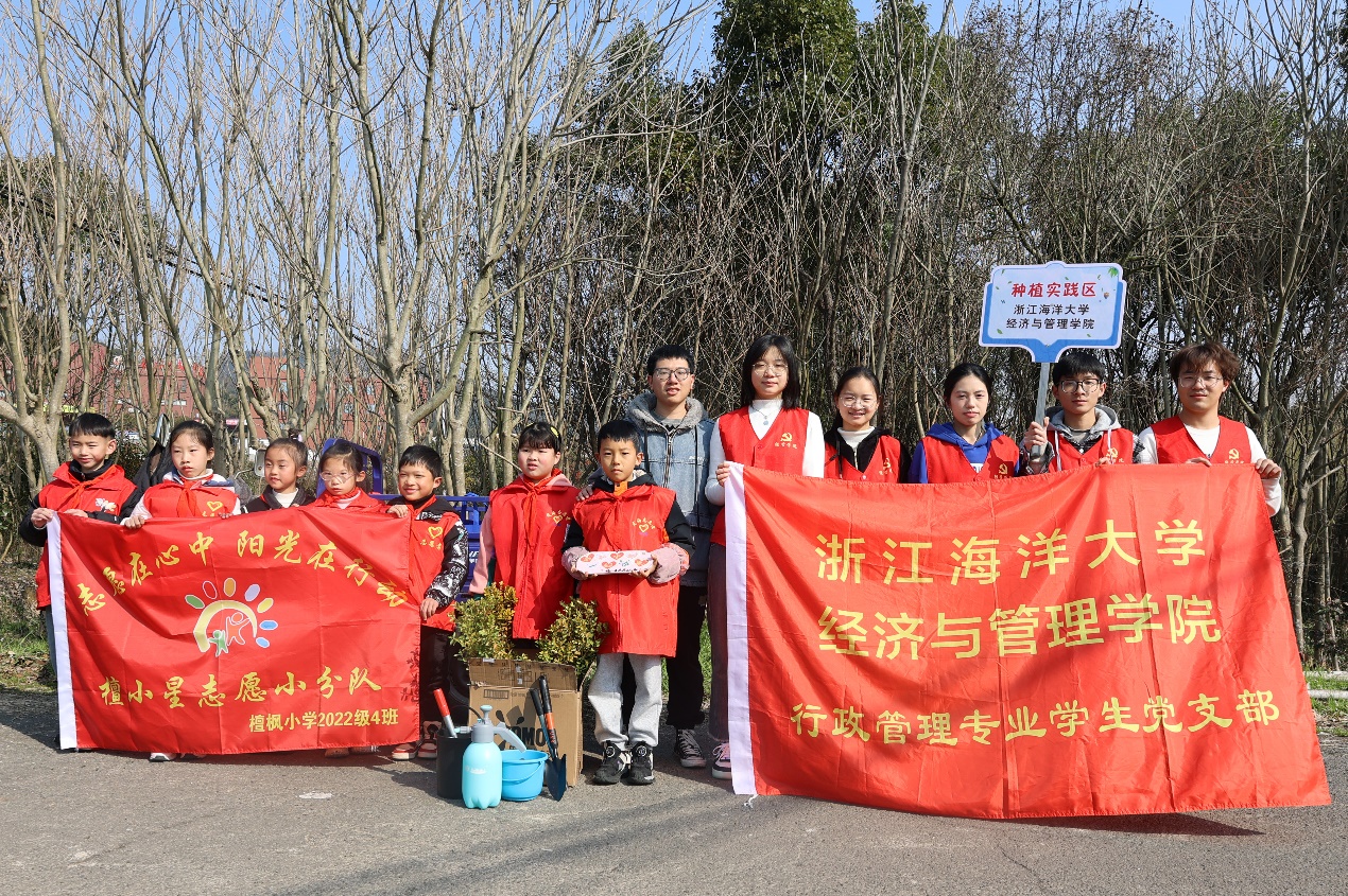 在我国第43个植树节到来时,为深入贯彻落实习近平生态文明思想和大学生社区实践计划,学习和弘扬雷锋精神,不断推动党团队一体化育人链条向社区延伸,3月10日上午,黄色网站 行政管理专业学生党支部青年志愿者联合蓬莱社区少先队员在定海区白泉镇“挖呀挖农耕研学亲子田园基地”开展植树节活动。院团委负责人、党支部书记施辰阳带队前往。