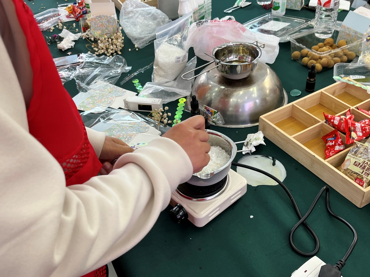 为陶冶志愿者的情操,社工中心还带领全体同学开展了香薰的制作,老师为大家讲解如何燃烧豆蜡、添加精油、倒入模具等一系列的操作步骤。融蜡、添芯、倒蜡、添香、粘花……现场香味四溢,大家其乐融融,享受着创作与手工制作带来的欢乐,表达了青年与社工的深厚情谊和共同追求。