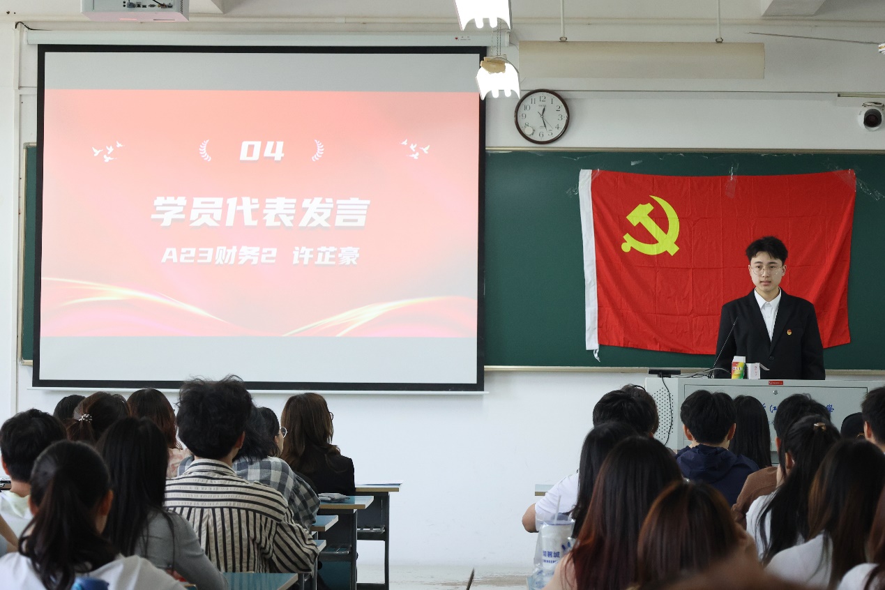 学员代表、来自A23财务2的许芷豪同学代表党训班全体学员向组织表态:第一,要珍惜培训机会,提升素质能力;第二,要服从组织管理,遵守纪律规矩;第三,要纯化入党动机,发挥模范作用。许芷豪表示,会时刻牢记自己的使命和责任,不断筑牢信仰之基、补足精神之钙、把稳思想之舵,争取早日成为一名光荣的共产党员。