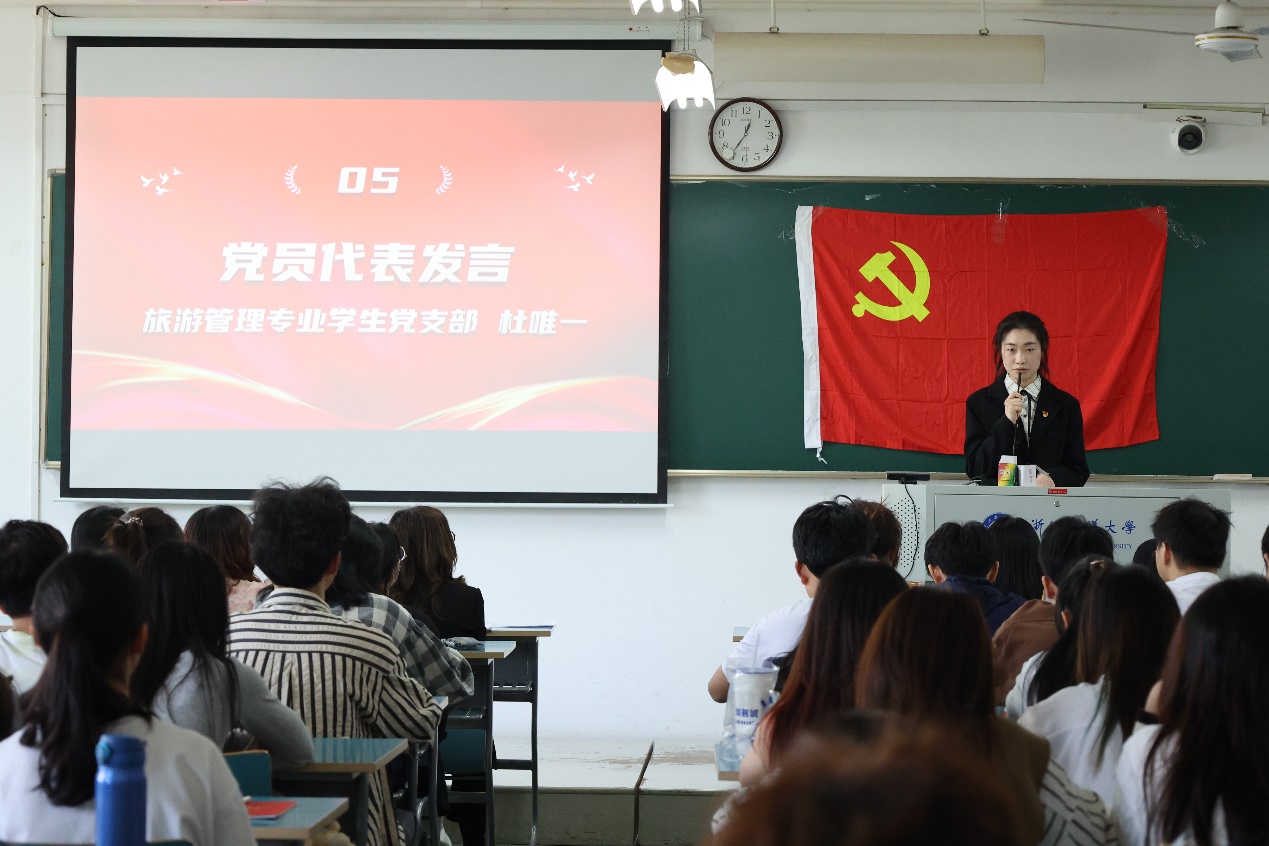 党员代表、来自旅游管理专业学生党支部的杜唯一同学希望全体学员在收获骄傲与光荣的同时,一定要倍加珍惜此次宝贵的学习机会,通过党训班更好地从思想上、行动上入党。杜唯一呼吁全体学员要致力于真正的学习,把握思想的航向;要致力于深刻的理解,掌握思想的力量;要致力于真正的应用,恪守知与行的统一,不仅要组织入党,还要思想入党,接好实现中国梦的“接力棒”。
