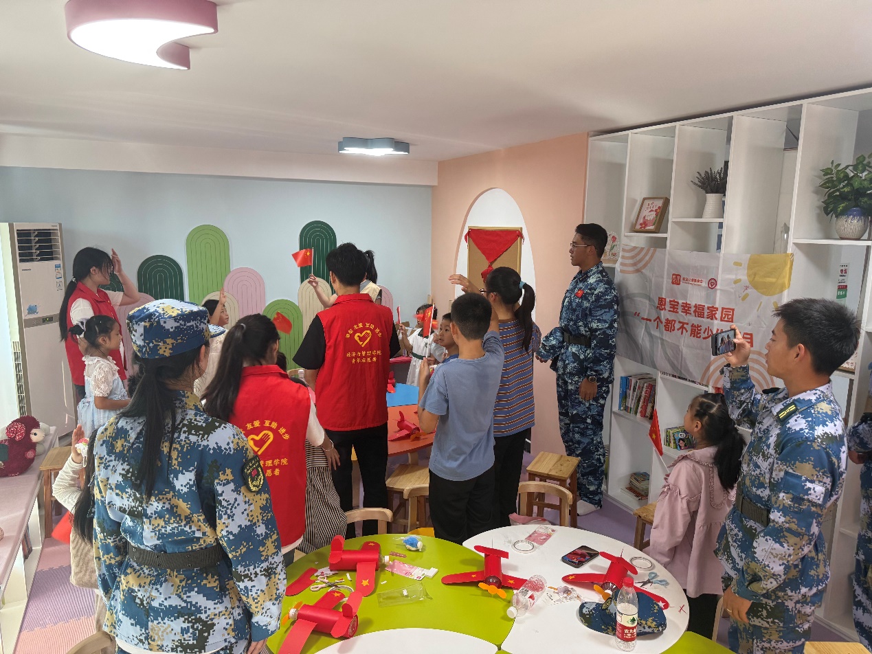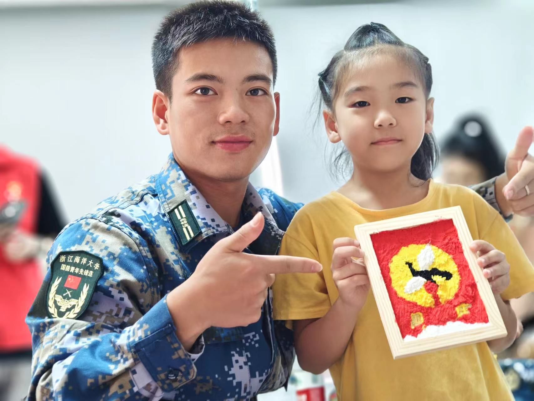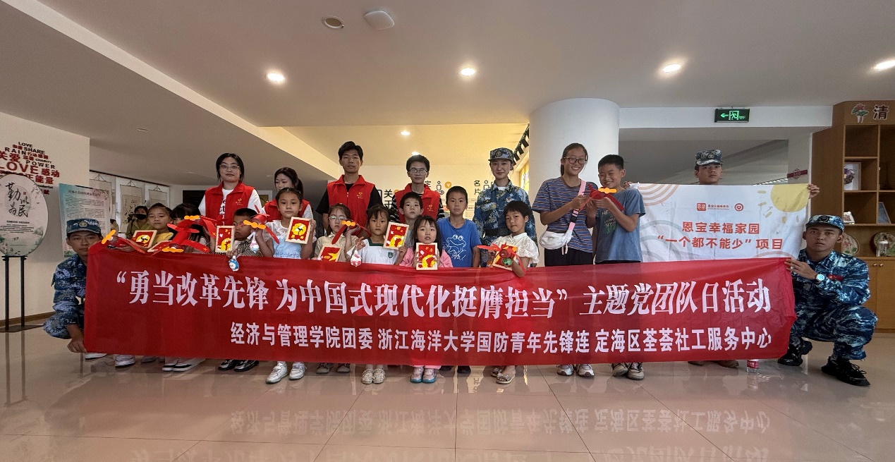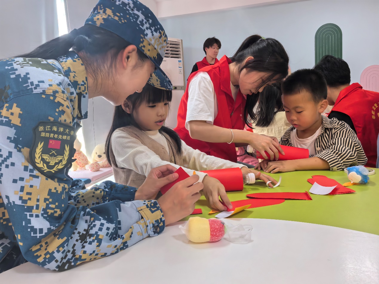 在舟山社保大楼未成年人保护中心,来自经管学生会临时团支部、先锋连团总支的党员、团员青年携手定海区荃荟社工服务中心开展了“朋辈交流引领,共话青春梦想”系列活动。活动中,同学们带领少先队员学唱了歌曲《歌唱祖国》,共同畅谈党的二十届三中全会精神。同学们还帮助少先队员共同制作卡纸类手工作品、爱国主题非遗纸浆画,加深了他们对祖国文化和历史的理解与热爱,促进了爱国主义精神的传承与弘扬。
