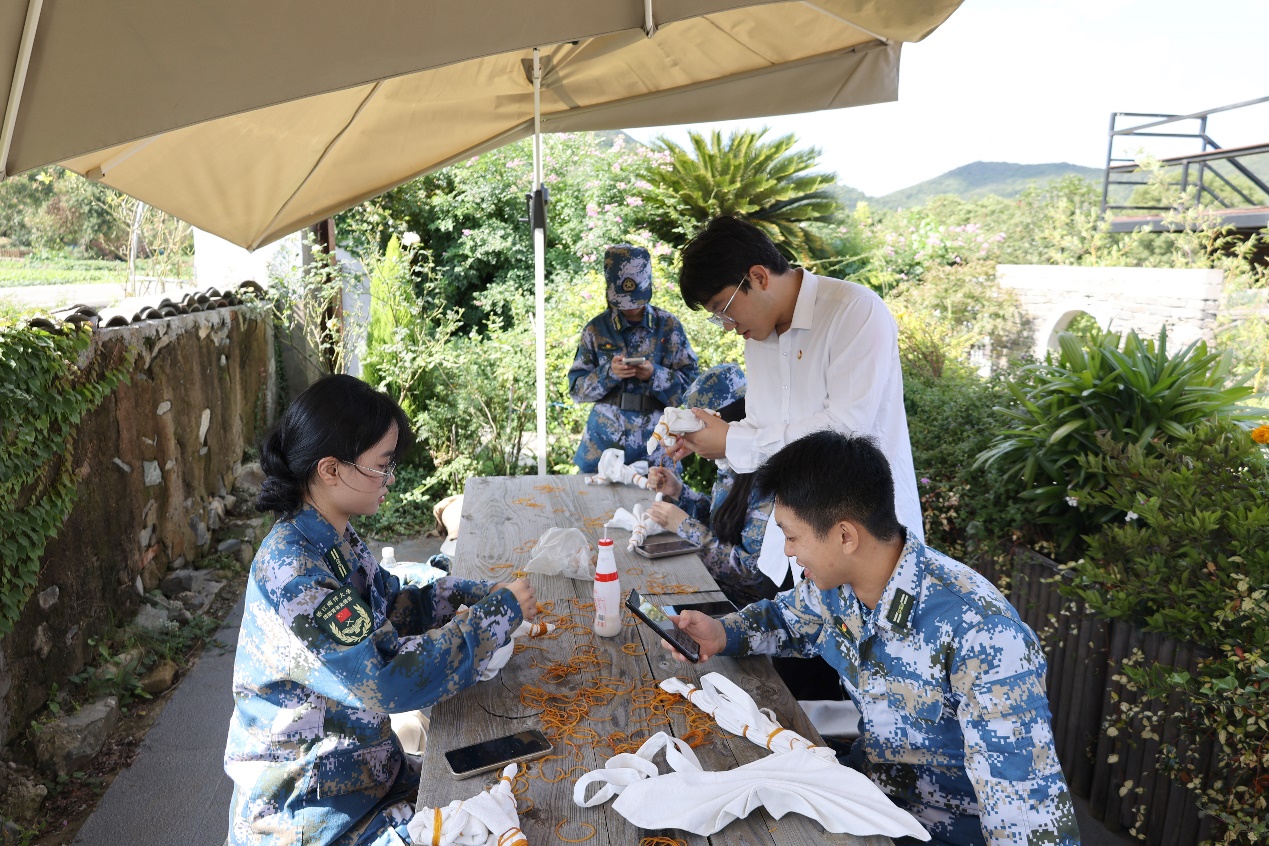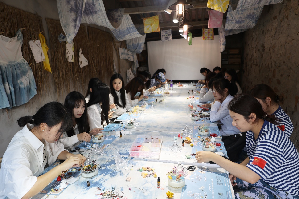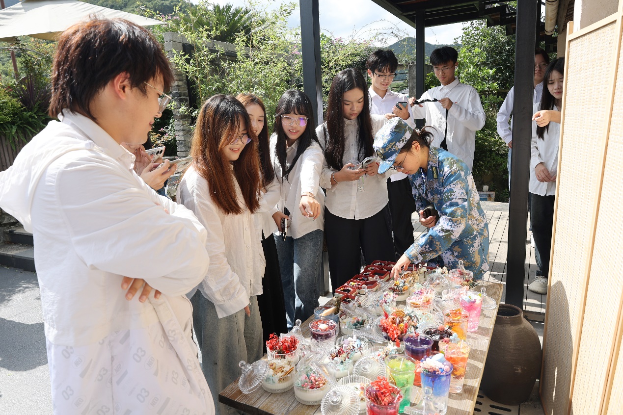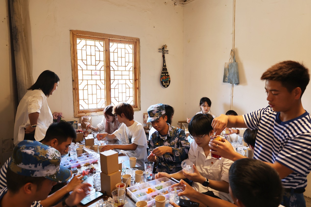 在马岙居山小院,非遗讲师团成员为党、团、队员们详细讲解了国家级非遗——蓝印花布印染技艺,省级非遗——舟山螺钿镶嵌以及串珠手作、饮料蜡烛等非遗传统技艺的历史渊源和文化内涵。他们通过现场演示和互动体验,展示了这些技艺的独特魅力和精湛工艺,强调了传承与保护非遗文化的重要性。随后,同学们通过亲身参与制作,进一步感受了非遗技艺的艺术价值,增强了以坚定的文化自信推进中国式现代化的决心。