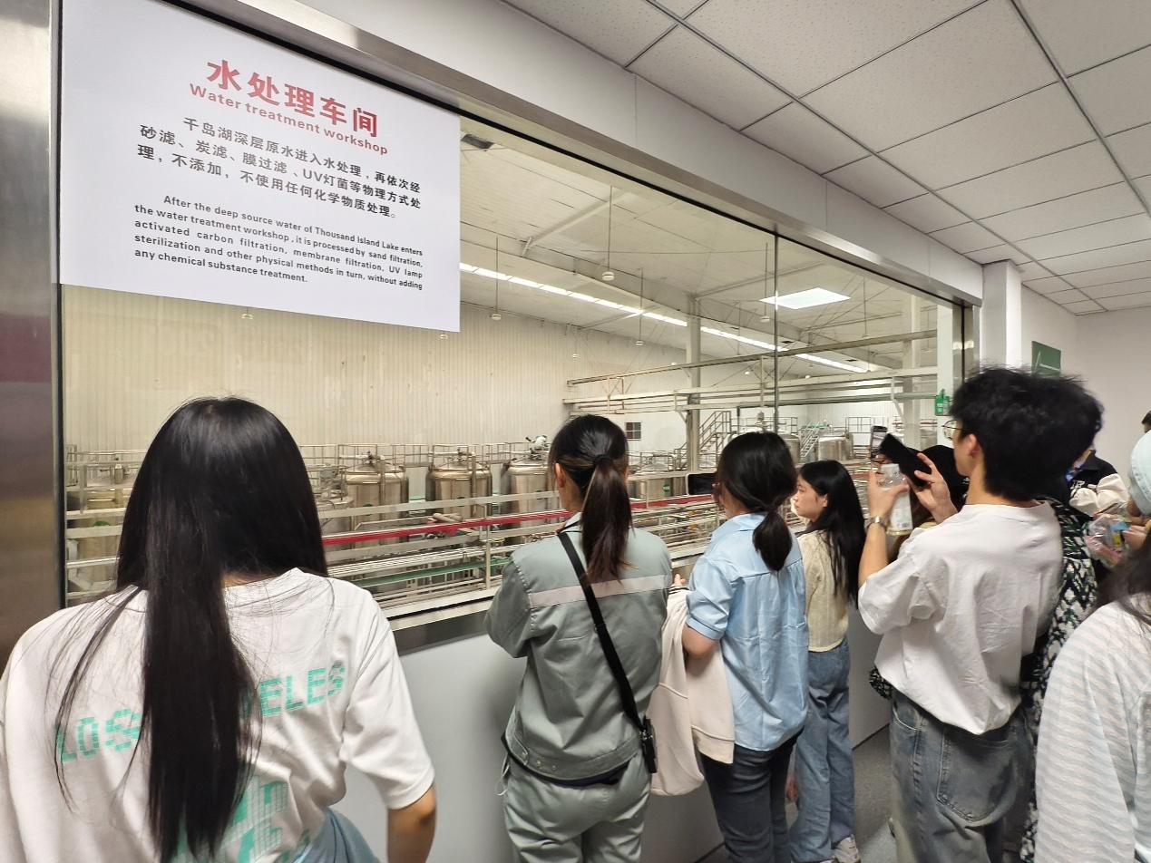 活动期间,学院师生党员亲还赴水源地实地取水,开展深层湖水测试比对实验,并品尝了茶园水域的天然饮用水,切身体验水源质量与企业标准。此外,大家还观看了全国各地水源地的视频介绍,全面了解农夫山泉的发展历程、企业文化、产品系列及园区规模,并实地参观了厂区的智能化生产线与产品超市,深入感受了企业现代化、绿色化、科技化的管理运营模式。