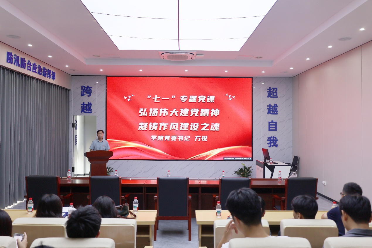 学院党委书记方锐以“弘扬伟大建党精神 凝铸作风建设之魂”为题,为全院师生党员讲授“七一”专题党课。方锐书记紧密结合深入贯彻中央八项规定精神学习教育,对全体党员提出三点要求:一是要坚定“四个自信”,赓续红色血脉;二是要强化理论武装,筑牢拒腐防变防线;三是要发挥“头雁效应”,推动学院高质量发展。方锐书记号召全体党员勇挑重担、争当先锋,以作风建设新成效开创学院高质量发展新局面。