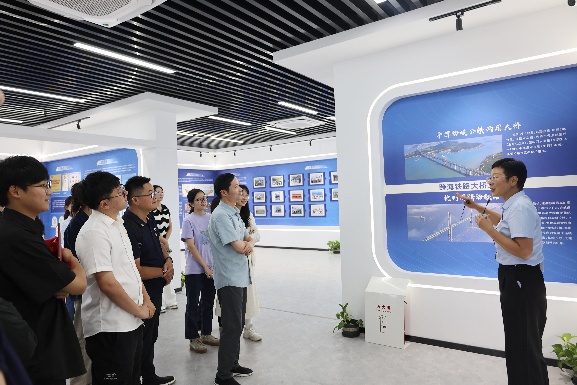 在桥文化展示馆内,刘春云为师生党员介绍了中国跨海大桥所取得的辉煌成就,强调了中铁大桥局积极响应国家“一带一路”倡议,努力开拓国际桥梁建筑市场的战略布局。随后,师生党员通过丰富多样的展示媒介,包括图文展板、实物模型以及多媒体互动演示,深入了解了西堠门公铁两用大桥的建设历程,学习了桥梁科技创新和管理经验的先进做法。刘春云还介绍了中铁大桥局独具特色的“桥头堡 党建”品牌工作体系和“1435”清廉甬舟公铁建设体系,展现了企业党建与项目建设深度融合的生动实践。
