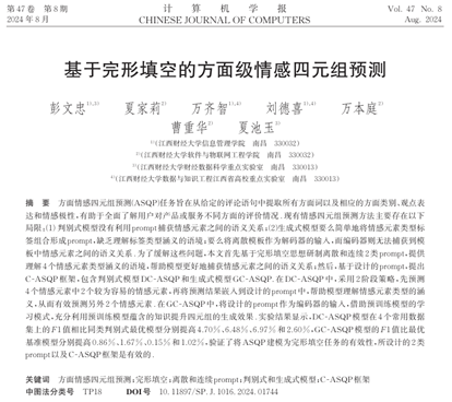 近日,计算机与人工智能学院博士生、财经数据科学重点实验室助理研究员彭文忠在国内权威期刊《计算机学报》2024年第8期上发表论文“基于完形填空的方面级情感四元组预测”。该文是在导师夏家莉教授和刘德喜教授(通讯)的指导下和万齐智讲师、万本庭副教授、曹重华讲师以及博士生夏池玉合作研究的成果。